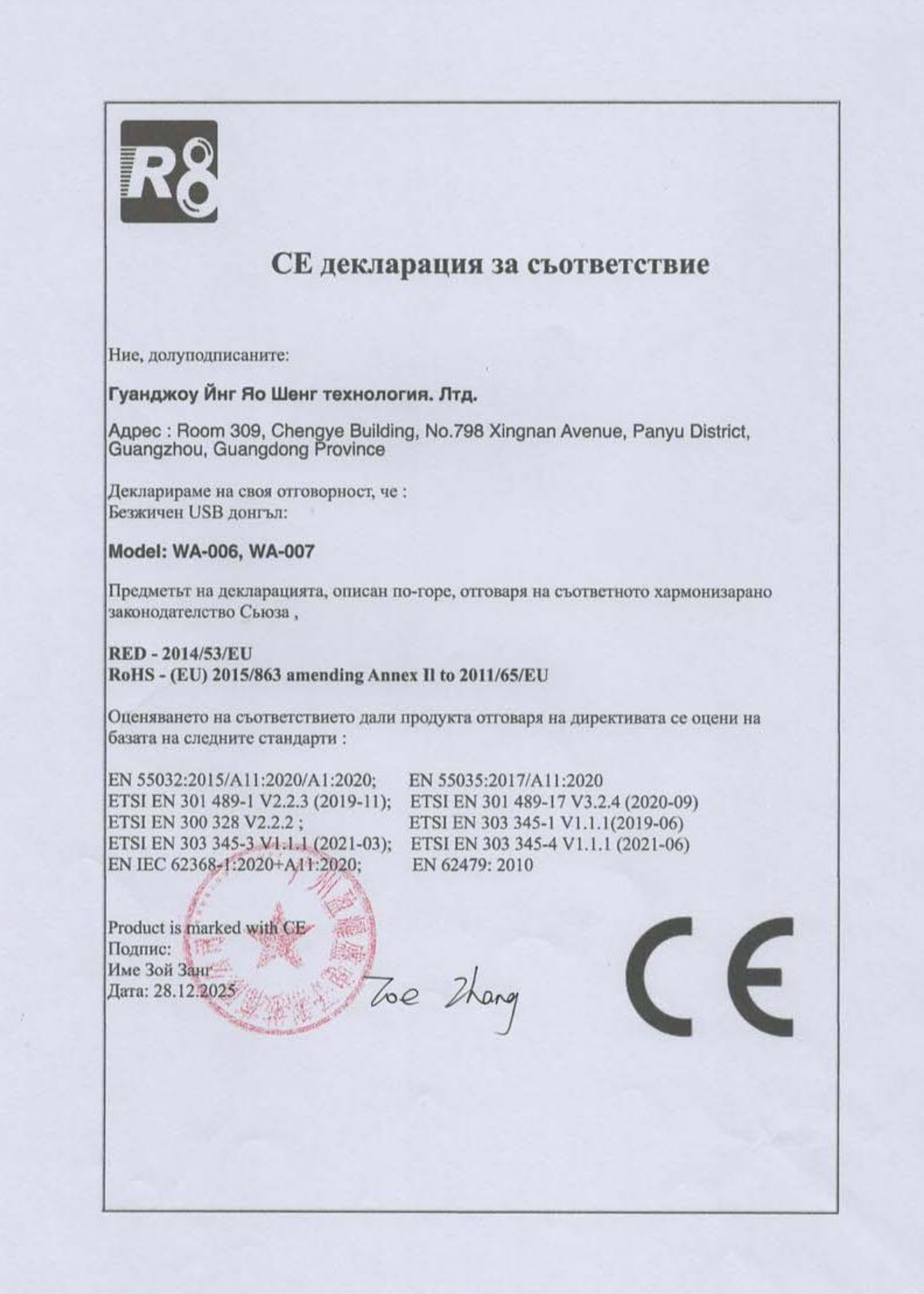 Декларации за съответствие на безжични рутери и мрежови карти