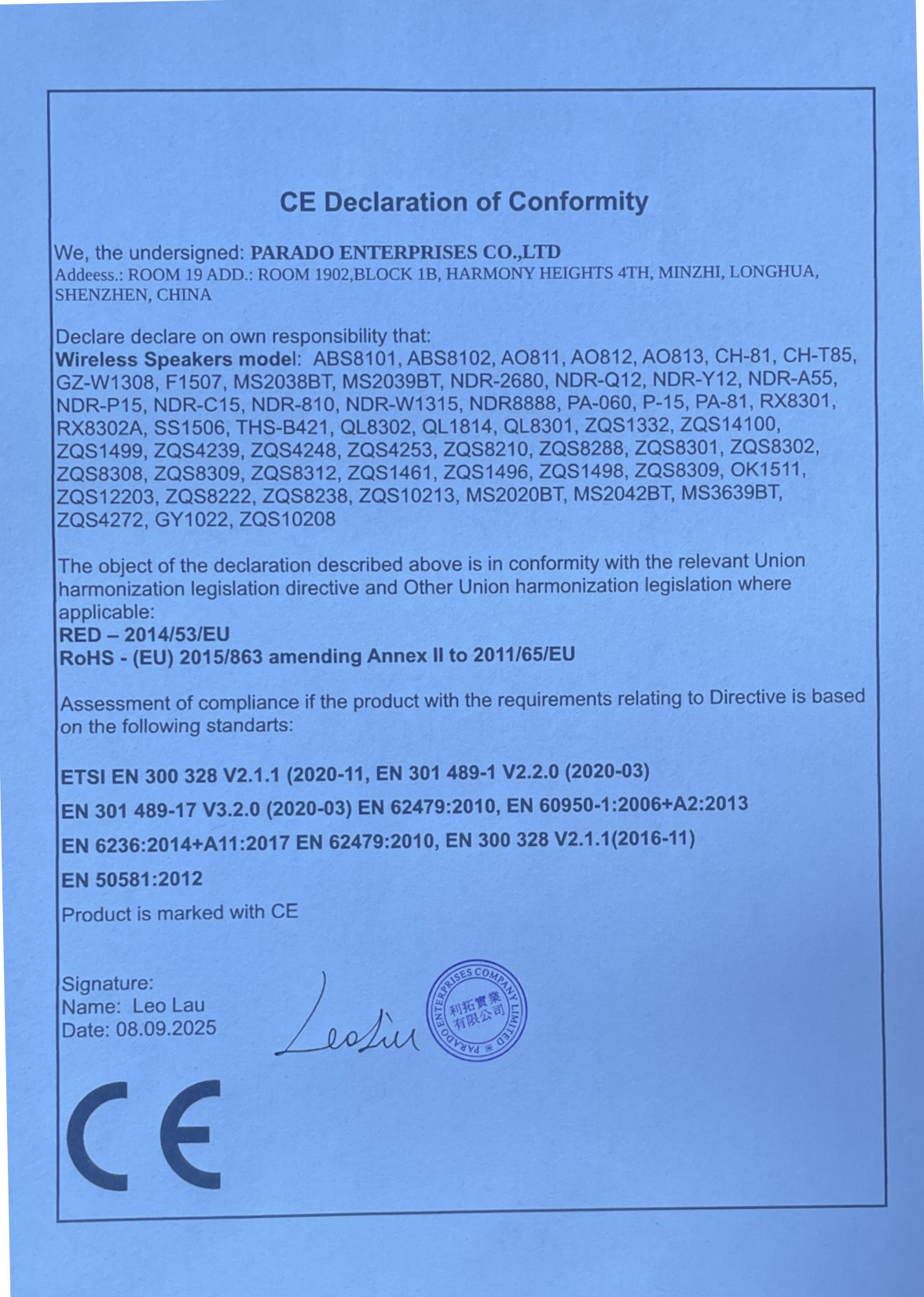 Декларации за съответствие на безжични тонколонки.