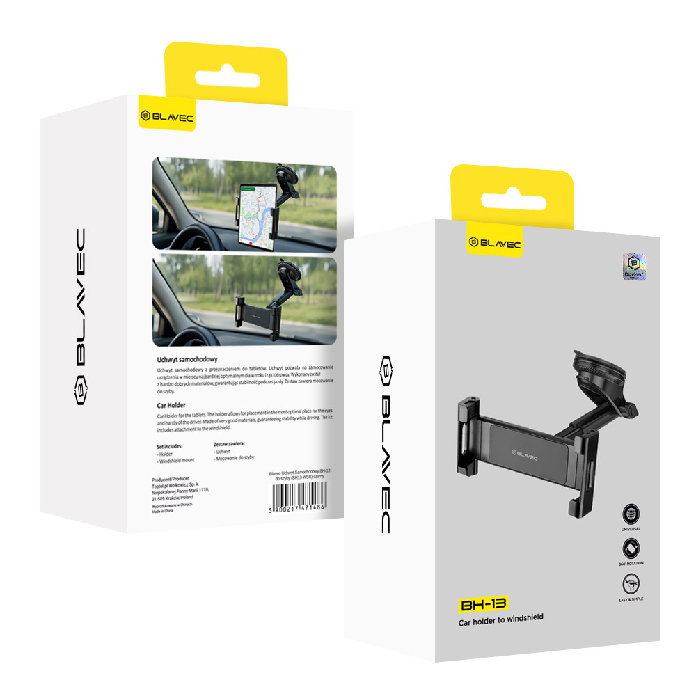 Blavec BH-13 е стабилна и универсална стойка за автомобил, предназначена за монтаж на предното стъкло. Осигурява отлична видимост на екрана, сигурен захват и комфорт по време на шофиране. Благодарение на регулируемите рамена, 360° въртене и здравата вендуза, стойката е подходяща за по-големи мобилни устройства и гарантира безопасна hands-free употреба на пътя.