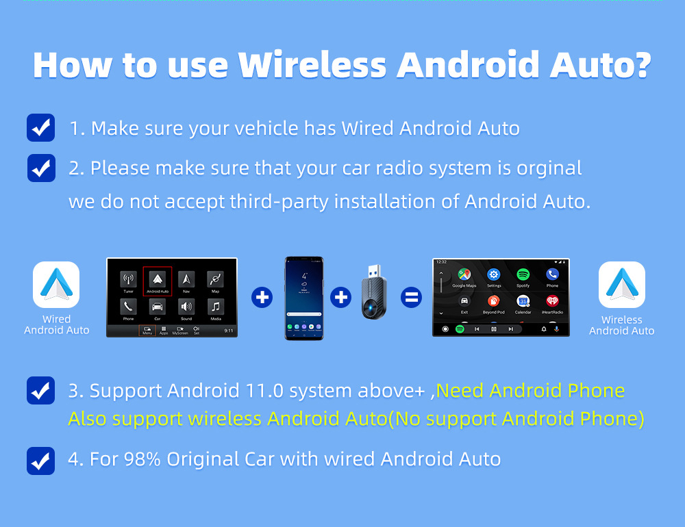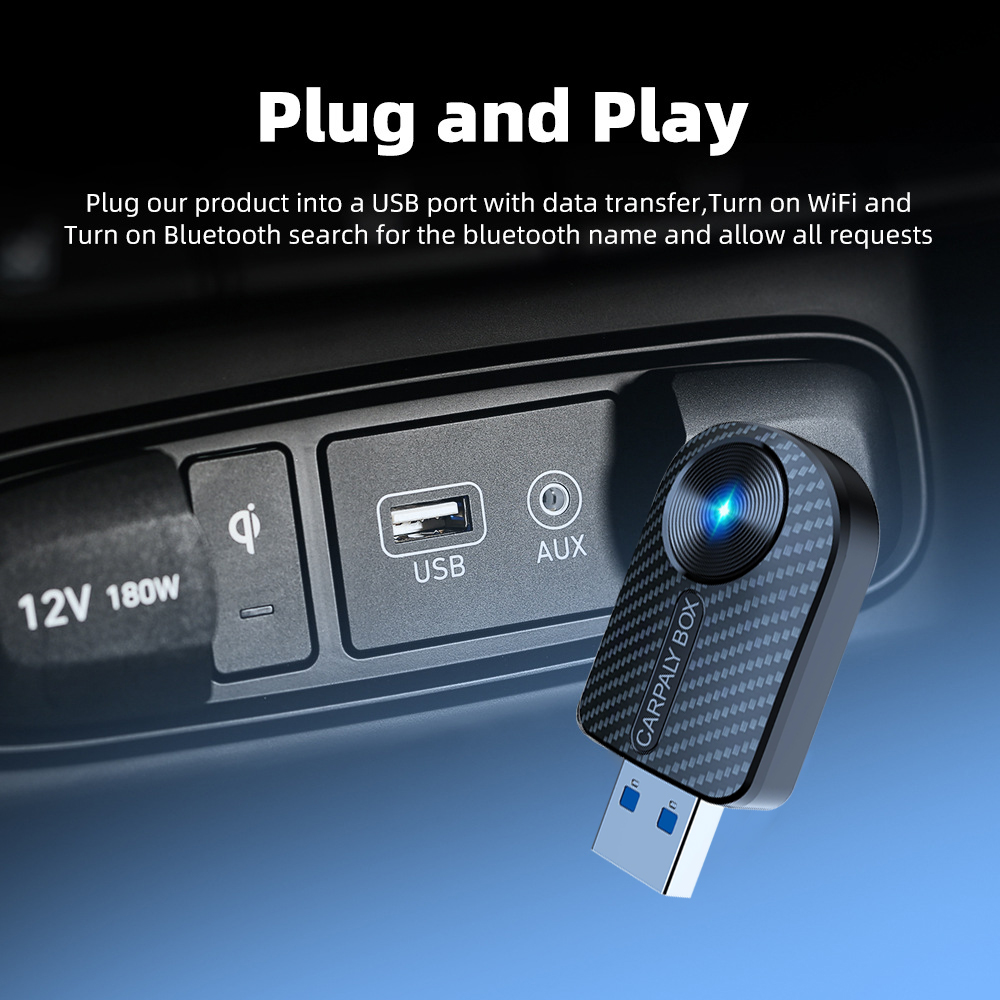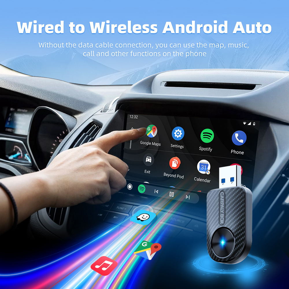 Практичен 2-в-1 адаптер, който превръща фабричния жичен CarPlay и Android Auto в безжичен, без нужда от допълнителни кабели. Просто включете устройството в USB порта на автомобила и се насладете на удобно и бързо свързване.