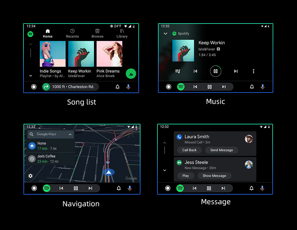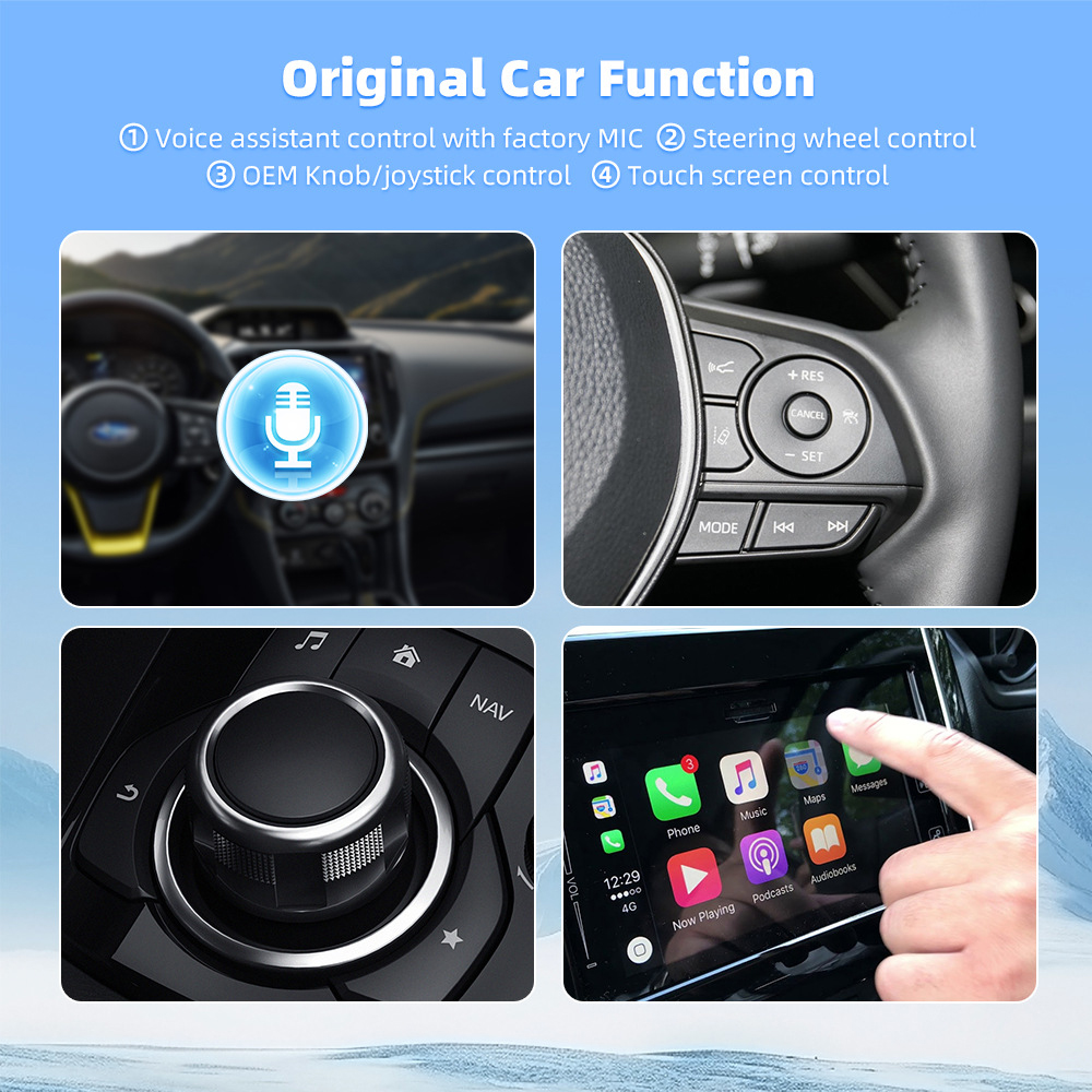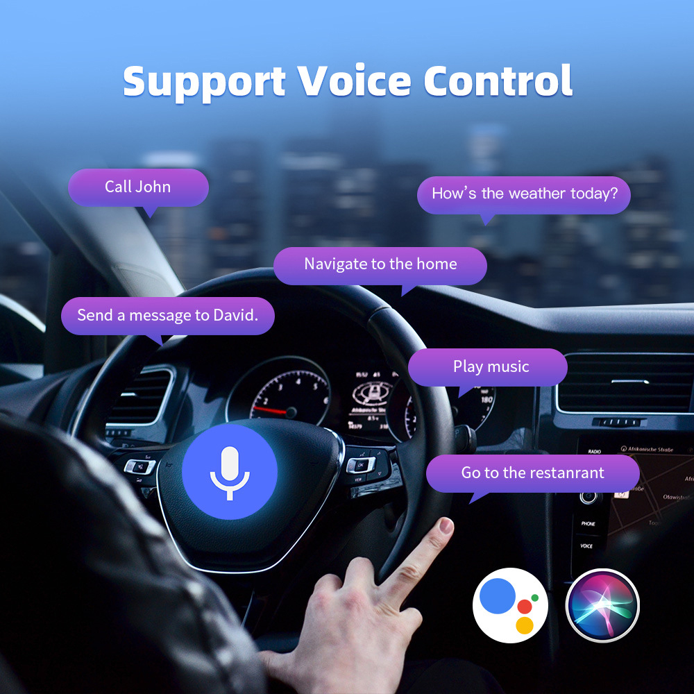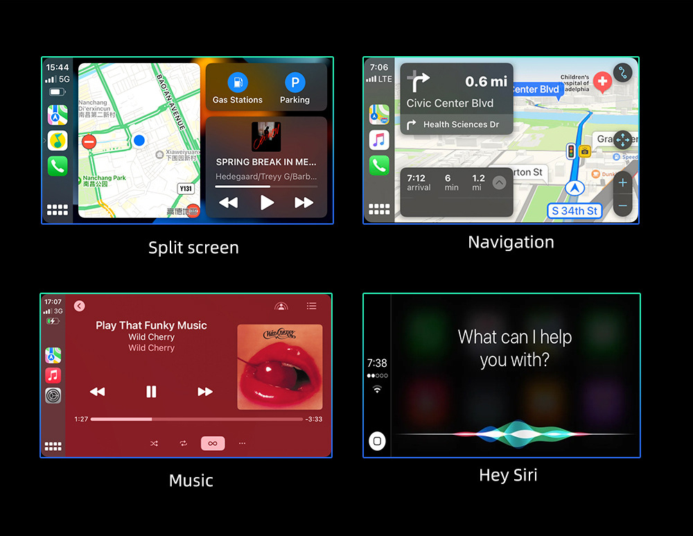 Позволява използване на навигация, музика, обаждания, съобщения, гласови асистенти (Siri / Google Assistant) и split screen функции директно на дисплея на автомобила.