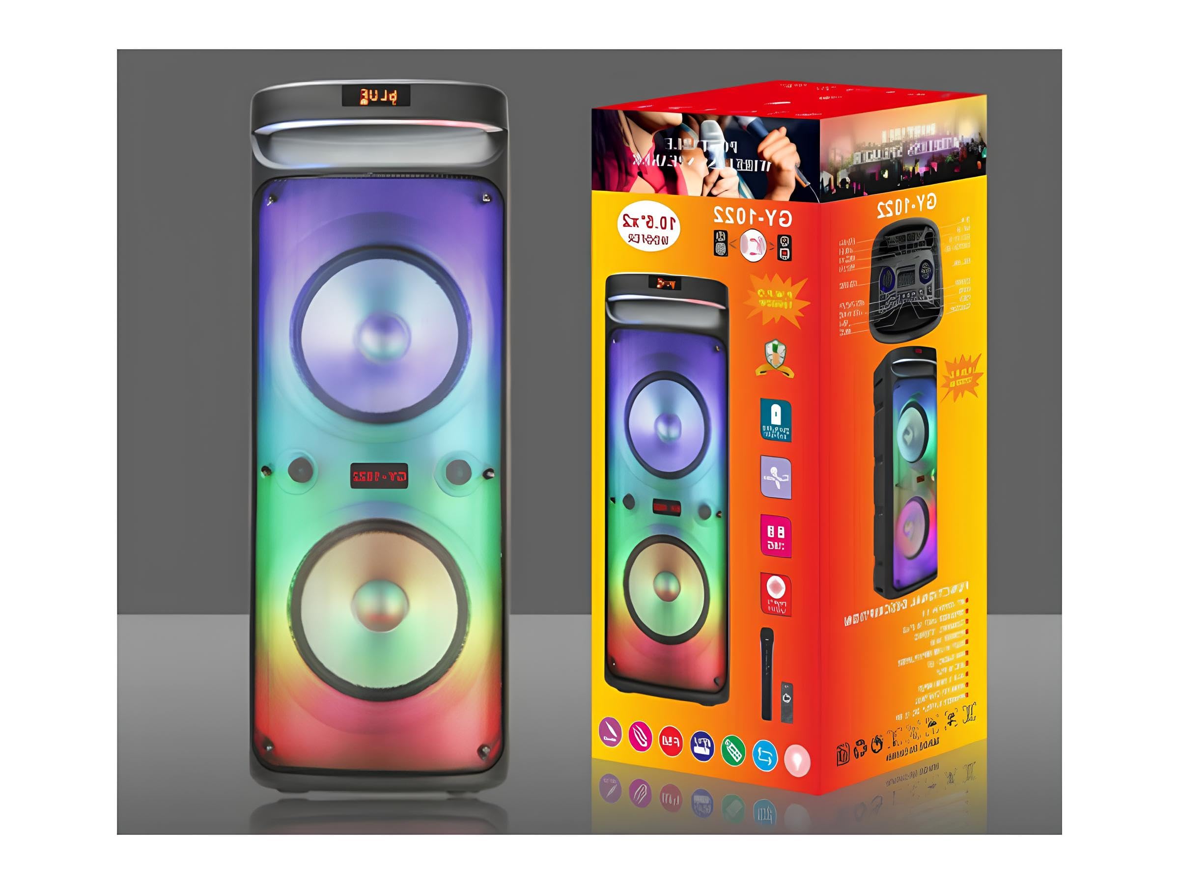 Активна акумулаторна тонколона GY-1022 с радиомикрофон – мощна акустична система с качествен звук, изразителен бас и светлинни ефекти в стил JBL.